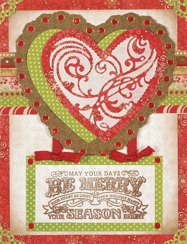 Card front: Place your card with the fold on the top. Cover with Christmas Sweets red snowflake patterned paper. Glue 6 1/4”x4 3/4” Christmas Sweets ivory patterned paper centered. Glue 5”x1 3/4” Christmas Sweets striped patterned paper horizontally 1 1/2” from the top. Glue 3 5/8”x2” Christmas Sweets green polka dot patterned paper 5/8” from the right and 3/8” from the bottom. Glue 3¼”x1½” Christmas Sweets ivory patterned paper centered on the green rectangle, stamp Christmas Cheer Stamp “May your Days be Merry…” centered on the ivory patterned paper. From Christmas Sweets brown patterned paper die cut 4 1/4” scalloped heart and glue 3/8” from the left and ¼” from the top. Die cut a 3¼” heart from Christmas Sweets green polka dot patterned paper, set aside pieces.