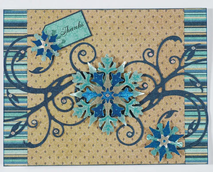 Write or computer print “Thanks” on aqua snowflakes paper and trim into a 1 3/8”x7/8” rectangle. Mat on dark blue textured paper with 1/16” borders and glue on the upper left portion of the card. Pop out the Frosty Flakes snowflakes. Layer with foam tape and glue on the swirl die-cuts as shown. Embellish the swirl die-cuts and snowflakes with Jewel Dazzles™.