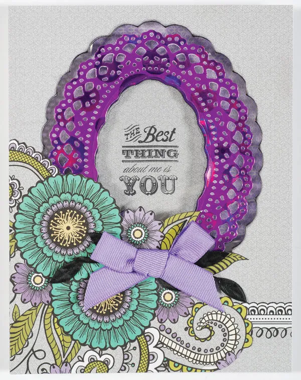 Cut one large lacey oval from holographic paper, then use the small scallop oval cutting die to cut out the center and glue centered on the window.