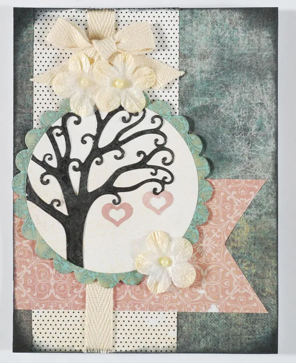Using the heart from Four Seasons Tree cutting die, and the Chalkboard pink patterned paper, cut out 10 hearts and set aside. Using 4 Circles and Scallops cutting die cut a large scallop from Chalkboard teal patterned paper. Next use the large circle cutting die to cut a circle from Chalkboard ivory patterned paper. Cut out the Four Seasons tree from the Chalkboard chalked patterned paper and glue to the ivory circle as shown. Trim even with the circle edges. Glue onto the teal scallop. Foam tape to the card front even with the left side and 1½” from the top. Apply Crystal Lacquer over the tree and let it dry completely. Glue 2 hearts hanging from the branches and Zot™ Ivory Blossoms to the card as shown.