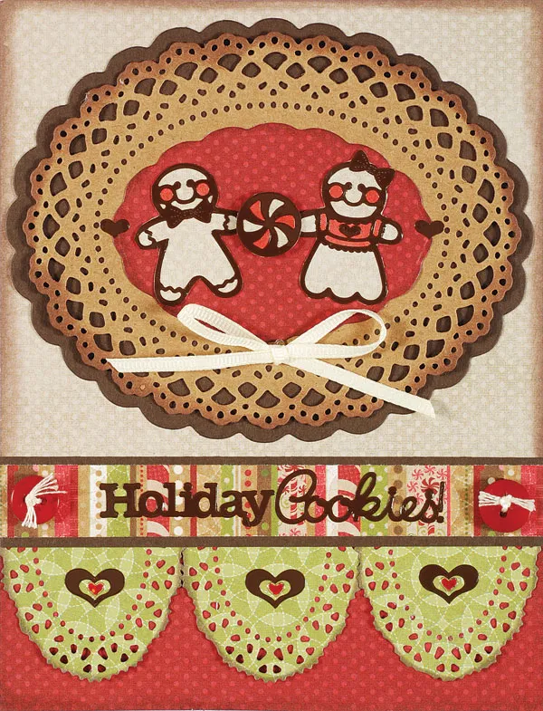 Techniques: Border: Die cut two 2 3/4” doilies from Christmas Sweets green tile paper. Ink edges and cut in half as shown. Glue 3 halves along the top edge of the Christmas Sweets red dot border at the card bottom. Place Gingerbread Dazzles™ hearts and Red Heart Jewel Dazzles™ on each doily. Mat 5”x3/4” Christmas Sweets stripe paper with brown cardstock, leaving 1/8” border. Glue across top edge of the doily halves. Thread 2 small red buttons with floss and knot. Zot to each side of the border. Place Gingerbread Dazzles™ “Holiday Cookies!” across the border.