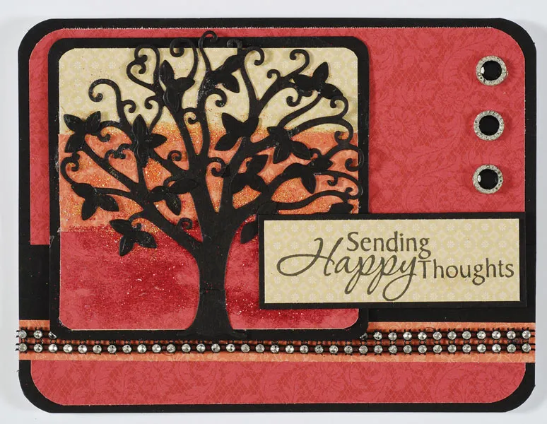 Cut 3¼”x1" Pretty Little Posies yellow patterned paper, and stamp Heartfelt Greetings “Sending Happy Thoughts” in the center. Mat on black cardstock leaving 1/16” borders. Foam tape even with the right edge and 1 3/8” from the bottom. Place Black Pave Crystals on the right side as shown.