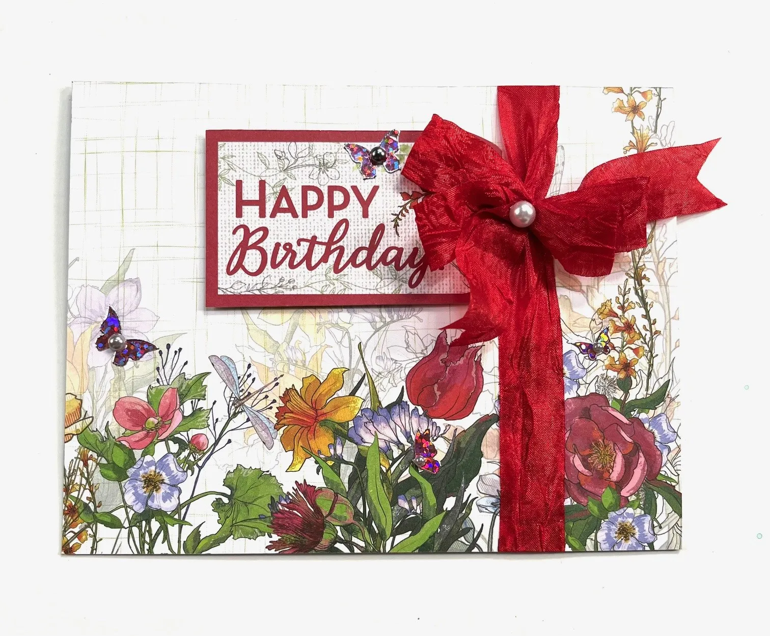 2. Make a 4-loop bow with the same ribbon and tie the center with thread. Glue the bow to the first ribbon,1¼" from the top and foam tape the “happy birthday” tag cutout beside it as shown. Place three pink butterfly Dazzles™ in the “garden area” and one on the tag as shown. Place a large pearl in the bow center and smaller pearls on the butterflies.