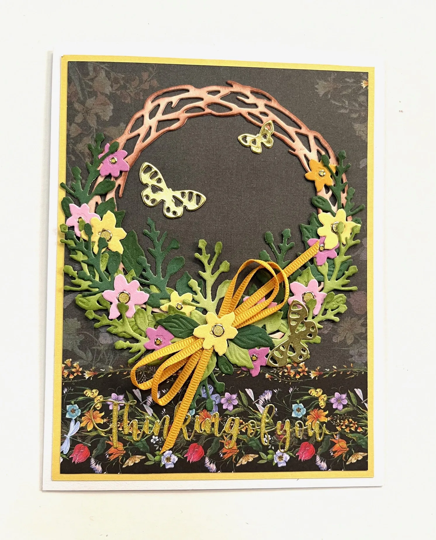 4. Die cut the four small blossoms from the two pink and the two yellow solid cardstocks. Glue the blossoms among the branches. Cut leaves and leaf sprigs from the remaining branch die-cuts and glue them among the flowers and around the bow. Die cut two large and one small butterfly from metallic gold cardstock and glue them to the front as shown. Glue a blossom in the bow center, then place jewel Dazzles™ on all the flower centers.