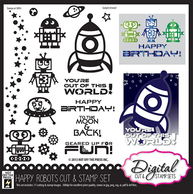 This cheerful set of Happy Robots Digital Stamps & Cutting files by Hot Off The Press come with 17 images in 6 file formats including AI, DXF, JPG, PDF, PNG and SVG. You'll have tons of possibilities with these digital stamps & cutting files! Digital stamps are extremely versatile. They're similar to traditional stamps, but with benefits! Digital stamps can be resized, flipped (mirror image), colorized and layered. You can even print them out and color just like any traditional acrylic or rubber stamped image. Plus, they are easy to store as they will not take up space in your craft room!