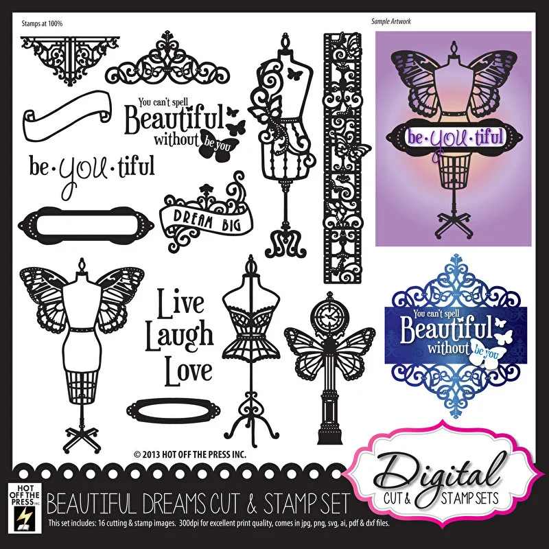 This fabulous set of Beautiful Dreams Digital Stamps & Cutting files by Hot Off The Press come with 16 images in 6 file formats including AI, DXF, JPG, PDF, PNG and SVG. You'll have tons of possibilities with these digital stamps & cutting files! Digital stamps are extremely versatile. They're similar to traditional stamps, but with benefits! Digital stamps can be resized, flipped (mirror image), colorized and layered. You can even print them out and color just like any traditional acrylic or rubber stamped image. Plus, they are easy to store as they will not take up space in your craft room!