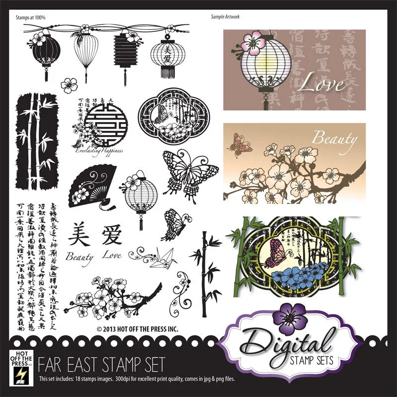 These elegant Asian inspired digital images by Hot Off The Press are perfect for digital scrapbooking, digital card making, and all your paper crafting needs. There are no limits to this versatile collection of 18 designs including lanterns, butterflies, blooms and words. Digital stamps are extremely versatile. They're similar to traditional stamps, but with benefits!