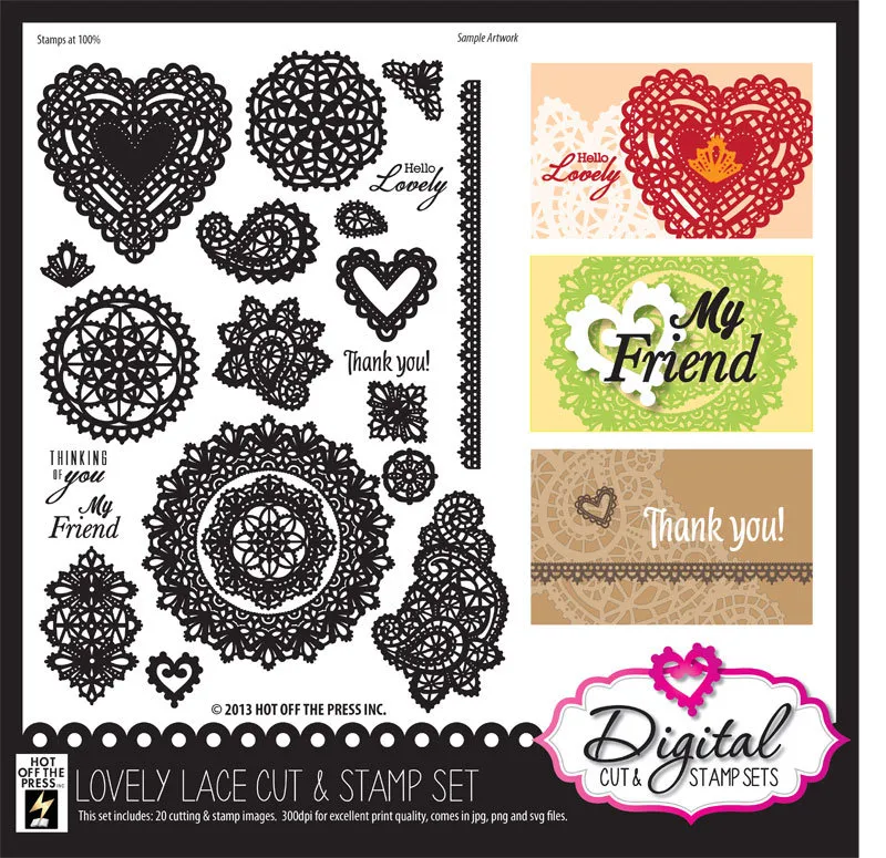 Lovely Lace Digital Cut & Stamp Set by Hot Off The Press comes with 20 images in 6 file formats including AI, DXF, JPG, PDF, PNG and SVG. Digital cutting files: AI, DXF, PDF and SVG formats. Stamp files: PNG & JPG formats.