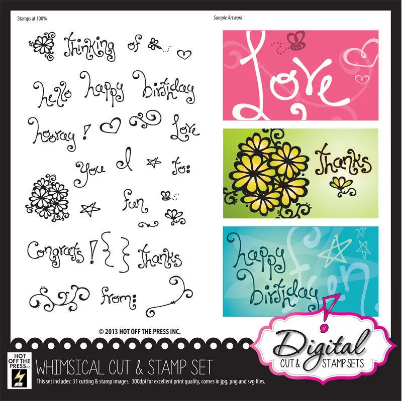 Whimsical Digital Cut & Stamp Set by Hot Off The Press comes with 31 images in 6 file formats including AI, DXF, JPG, PDF, PNG and SVG. Digital cutting files: AI, DXF, PDF and SVG formats. Stamp files: PNG & JPG formats.
