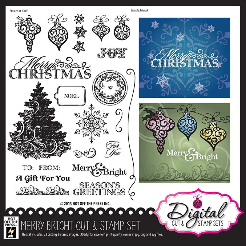 Merry Bright Digital Cut & Stamp Set by Hot Off The Press comes with23 images in 6 file formats including AI, DXF, JPG, PDF, PNG and SVG. Digital cutting files: AI, DXF, PDF and SVG formats. Stamp files: PNG & JPG formats.
