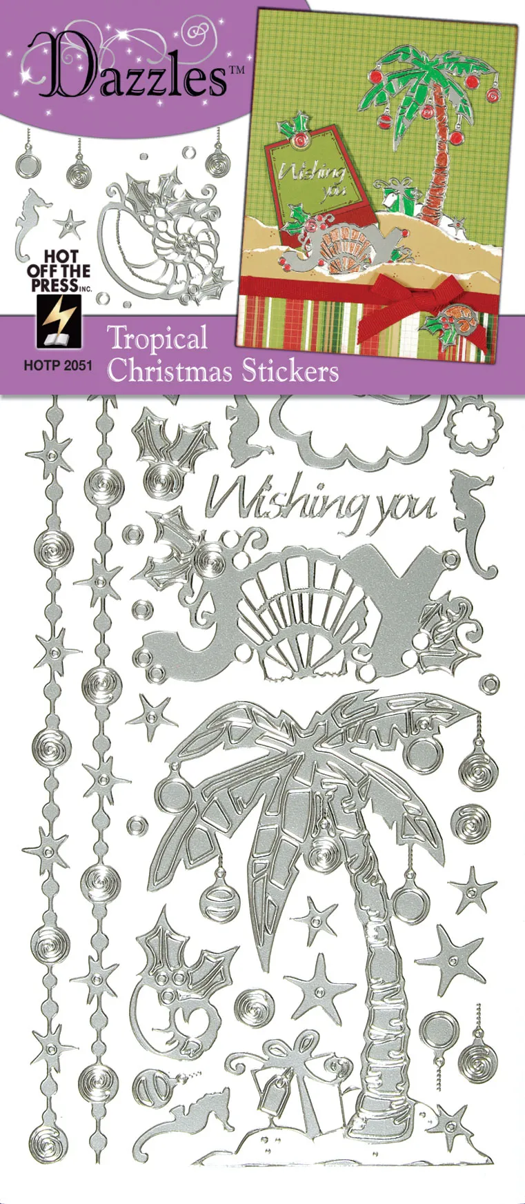 Dazzle em! Give Christmas cards, layouts and tags a unique touch of shine with this dazzling assortment of playful silver tropical Christmas icons . Youll have the look of a heat-embossed imagebut all you do is peel and stick! This 4x9 sheet has 36 stickers, including focals, borders, corners and smaller accent pieces. Even better, your Dazzles also come packaged with an idea sheet showing a finished card idea, additional ideas for using Dazzles, and how to use the Dazzles Transfer Sheet to make your Dazzles sheet do double-duty. A Paper Wishes Exclusive!
