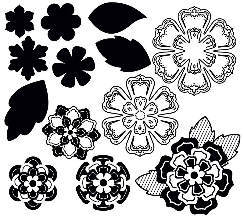 Flowers of every size and for all your needs! Use this huge bundle of 23 flower and leaves cutting files with your Silhouette Electronic Cutter to create pretty, frilly blossoms for scrapbooking, card making, tags, gift bags, and other papercrafts. Simply download the file and follow the directions from the Silhouette manufacturer to add it to your library. Cut the flowers from your desired papers, cardstock or specialty papers, then have fun finding places and projects for them! For even more depth in your design, lift up the center area of each petal and curl them slightly with your fingers. You'll love how easy it is to create lovely, layered, frilly blossoms and then discovering uses for all 23 of them!