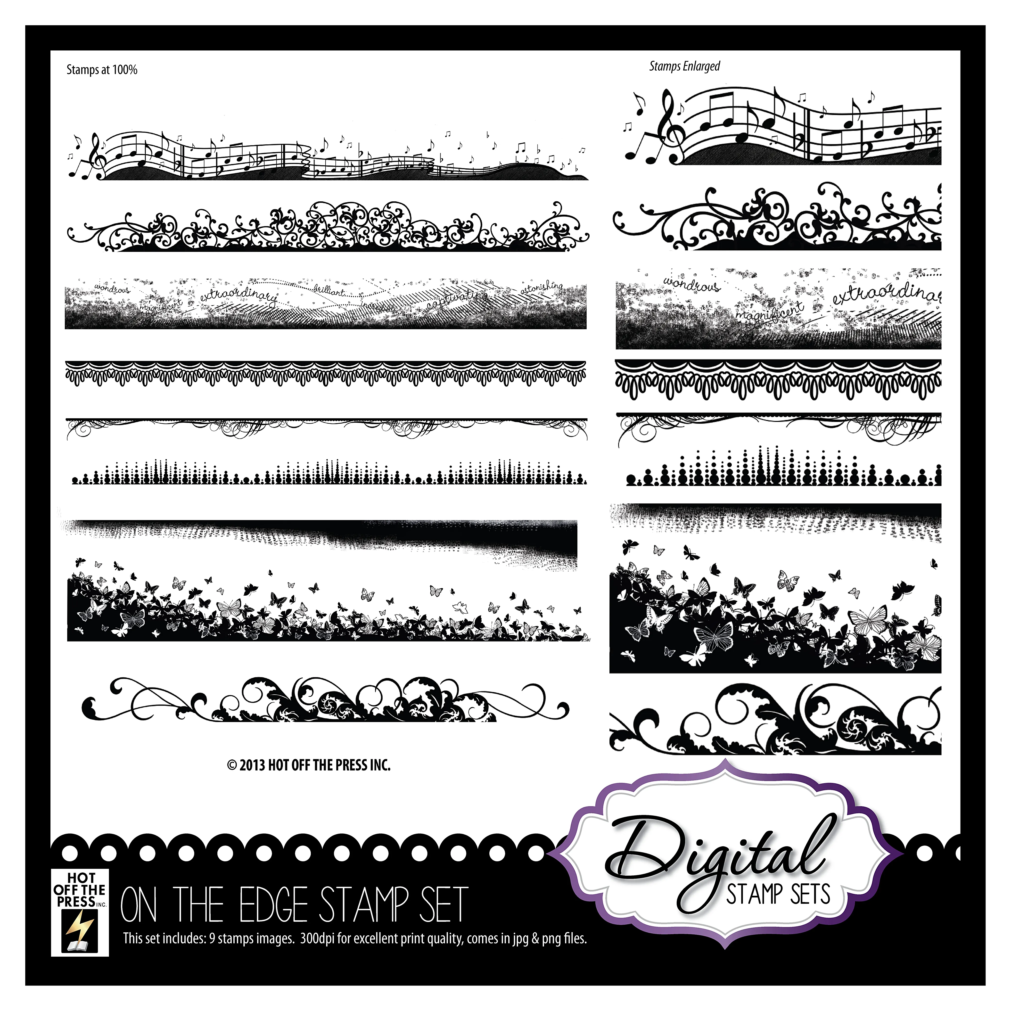 On The Edge Digital Stamping Collection! These elegant edges and beautiful border stamps by Hot Off The Press are perfect for digital scrapbook pages, digital card making and paper crafts. You'll be inspired by this sophisticated collection of 9 versatile designs including musical notes, swirls, butterflies, scrollwork and flourishes. Digital stamps are extremely versatile. They're similar to traditional stamps, but with benefits! Digital stamps can be resized, flipped (mirror image), colorized and layered. You can even print them out and color just like any traditional acrylic or rubber stamped image. Plus, they are easy to store as they will not take up space in your craft room! You will receive 9 individual files in both PNG (transparent) and JPG format. All digital images are 300dpi print quality and are compatible with Mac and PC computers.