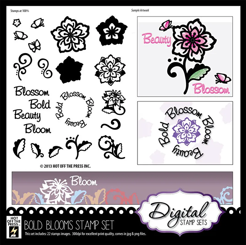 Bold Blooms Digital Stamping Collection! These fabulous floral images by Hot Off The Press are perfect for digital scrapbooking, digital card making, and all your paper crafting needs. There are no limits to this versatile collection of 24 designs including flowers, butterflies, blooms and words. Digital stamps are extremely versatile. They're similar to traditional stamps, but with benefits! Digital stamps can be resized, flipped (mirror image), colorized and layered. You can even print them out and color just like any traditional acrylic or rubber stamped image. Plus, they are easy to store as they will not take up space in your craft room! You will receive 24 individual files in both PNG (transparent) and JPG format. All digital images are 300dpi print quality and are compatible with Mac and PC computers.