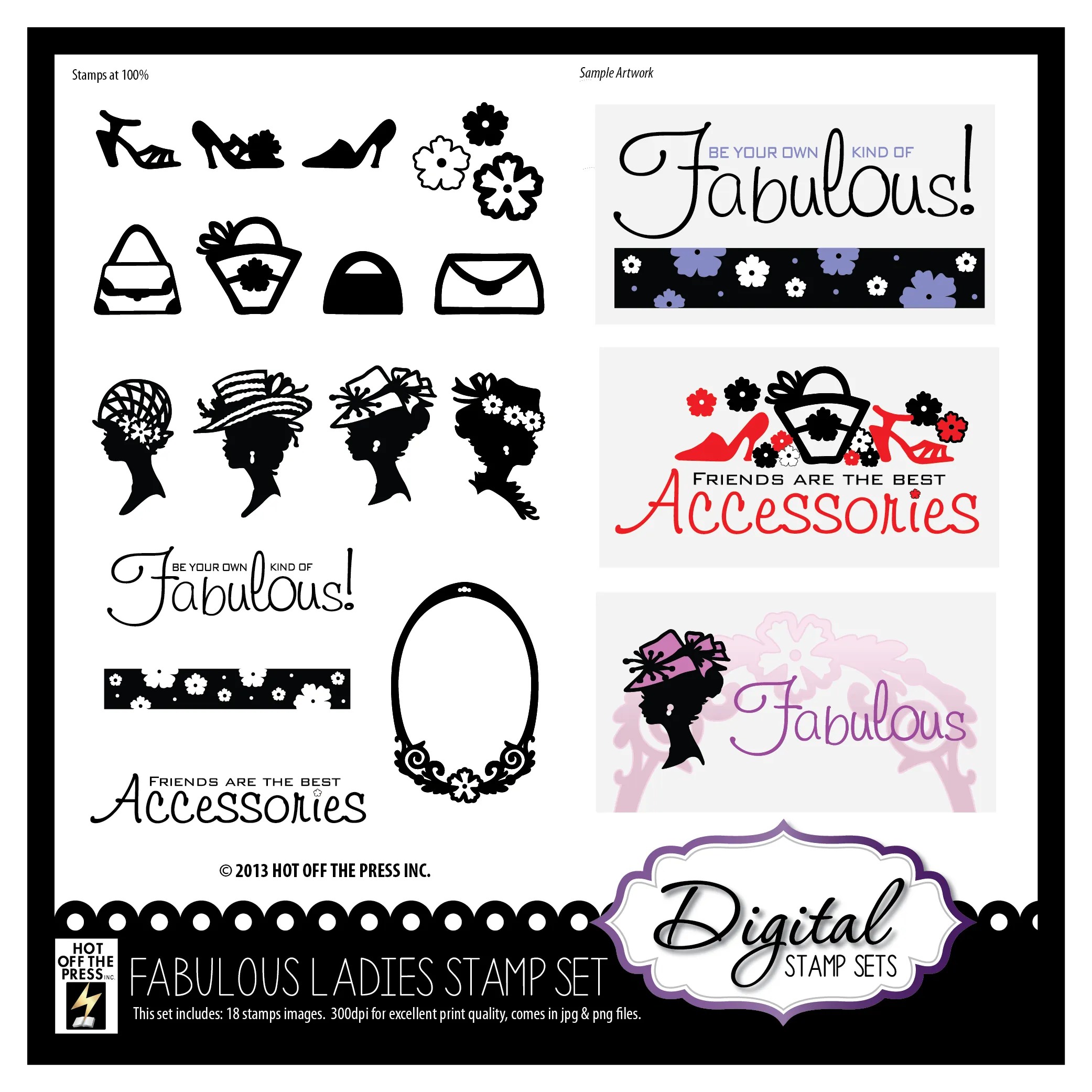 Fabulous Ladies Digital Stamping Collection! These fabulous ladies images by Hot Off The Press are perfect for digital scrapbooking, digital card making, and all your paper crafting needs. There are no limits to this versatile collection of 18 designs including shoes, purses, silhouettes, and phrases. Digital stamps are extremely versatile. They're similar to traditional stamps, but with benefits! Digital stamps can be resized, flipped (mirror image), colorized and layered. You can even print them out and color just like any traditional acrylic or rubber stamped image. Plus, they are easy to store as they will not take up space in your craft room! You will receive 18 individual files in both PNG (transparent) and JPG format. All digital images are 300dpi print quality and are compatible with Mac and PC computers.