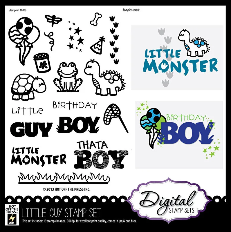 Little Guy Digital Stamping Collection! These adorable collection of images for little boys by Hot Off The Press are perfect for digital scrapbooking, digital card making, and all your paper crafting needs. There are no limits to this versatile collection of 19 designs including balloons, a turtle, dinosaur, dino-tracks, bug jar, frog and phrases. Digital stamps are extremely versatile. They're similar to traditional stamps, but with benefits! Digital stamps can be resized, flipped (mirror image), colorized and layered. You can even print them out and color just like any traditional acrylic or rubber stamped image. Plus, they are easy to store as they will not take up space in your craft room! You will receive 19 individual files in both PNG (transparent) and JPG format. All digital images are 300dpi print quality and are compatible with Mac and PC computers.