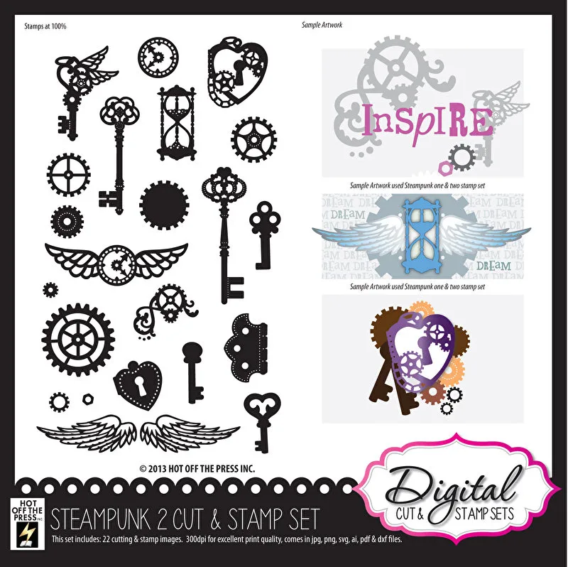This versatile set of Steampunk Two Digital Stamps & Cutting files by Hot Off The Press comes with 22 images in 6 file formats including AI, DXF, JPG, PDF, PNG and SVG. You'll have tons of possibilities with these digital stamps & cutting files! Digital stamps are extremely versatile. They're similar to traditional stamps, but with benefits! Digital stamps can be resized, flipped (mirror image), colorized and layered. You can even print them out and color just like any traditional acrylic or rubber stamped image. Plus, they are easy to store as they will not take up space in your craft room!