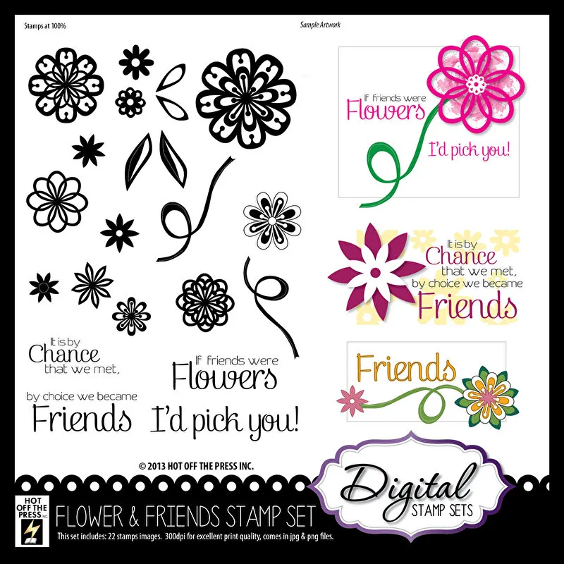 Flowers and Friends Digital Stamping Collection! These sweet floral images by Hot Off The Press are perfect for digital scrapbooking, digital card making, and all your paper crafting needs. There are no limits to this versatile collection of 22 designs including flowers, leaves, and phrases. Digital stamps are extremely versatile. They're similar to traditional stamps, but with benefits! Digital stamps can be resized, flipped (mirror image), colorized and layered. You can even print them out and color just like any traditional acrylic or rubber stamped image. Plus, they are easy to store as they will not take up space in your craft room! Paper Wishes Exclusive!