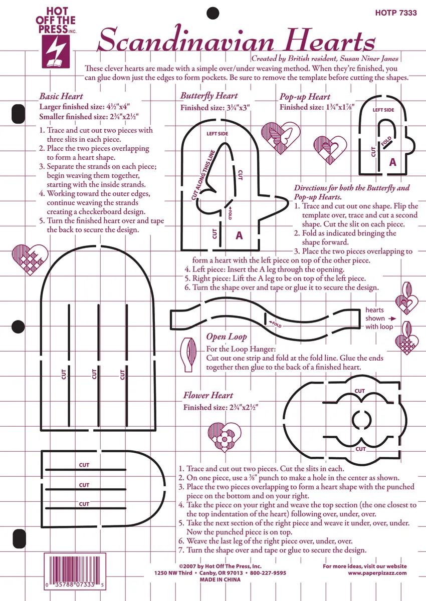 Clever paper hearts. These traditional Scandinavian hearts lend a lovely touch to your cards, scrapbook pages, gift packages and more. The new template from designer Susan Niner Janes’ features 5 heart designs: A large and a small Basic Heart, Butterfly Heart, Pop-up Heart and Flower Heart, plus an Open Loop pattern for creating a hanger. The finished look is beautiful, and easy to do: Trace the shape onto your paper, cut it out and use a simple over/under weaving method. Template contains diagrams and instructions. The finished result is lovely!
