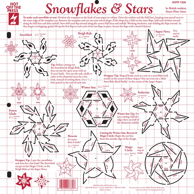 Stunning snowflakes and stars! This new template features fabulous folded snowflakes and stars created by designer Susan Niner Janes. Its easy to get a gorgeous dimensional effect on cards and scrapbook pagessimply trace, cut and fold. The template contains specific instructions for each of the 8 shapes, complete with diagrams of the finished embellishment.