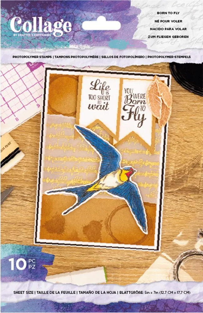 10 Born To Fly Stamp Set from Crafter's Companion! In the Born To Fly set, you will receive 10 clear stamps with backgrounds, feather embellishments and sentiments. They're great for stacking together to create your very own beautiful collages!