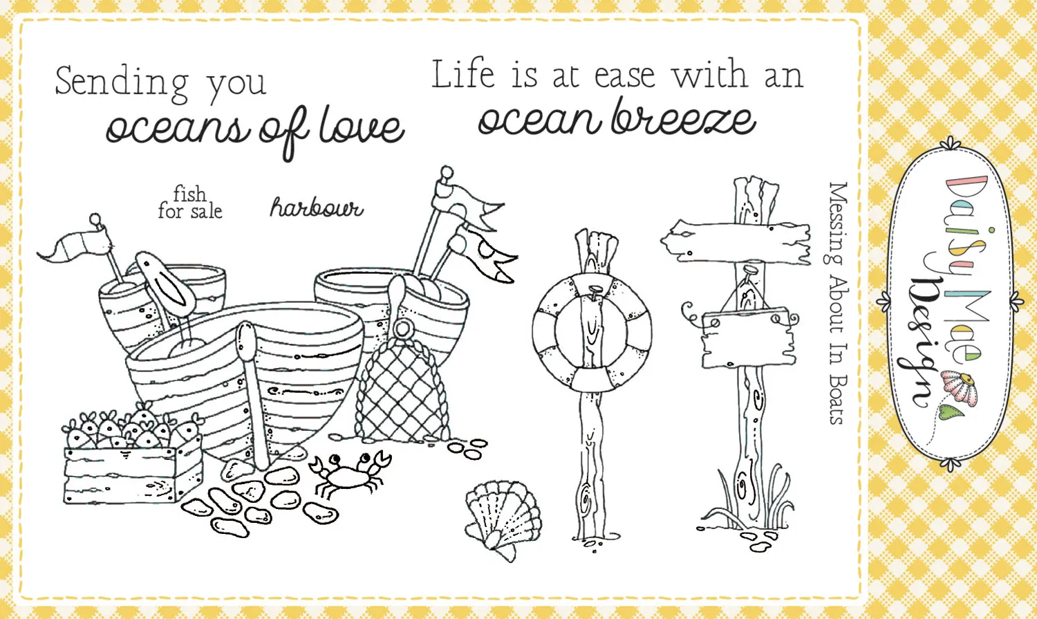 - Includes boats, seashell, and sentiments: “Fish for sale”, “Sending you oceans of love”, and “Harbour”