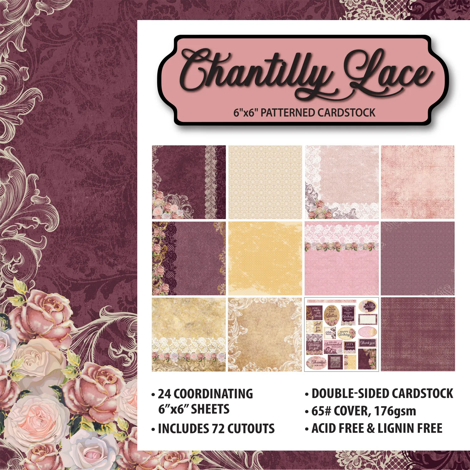 Chantilly Lace 6"x6" Patterned Cardstock from Hot Off The Press! This beautiful Chantilly Lace Patterned 6"x6" Cardstock pack consists of stunning florals against shades of burgundy, soft pink and gold! Sheets are filled with stylish patterns, intricate lace, and beautiful flowers. 24 sheets (2 each of 6 designs) of 65# cover weight cardstock, 12"x12" sheets! Pack includes 72 cut-outs! Sheets are acid & lignin free. Made in the USA! Paper Wishes Exclusive!