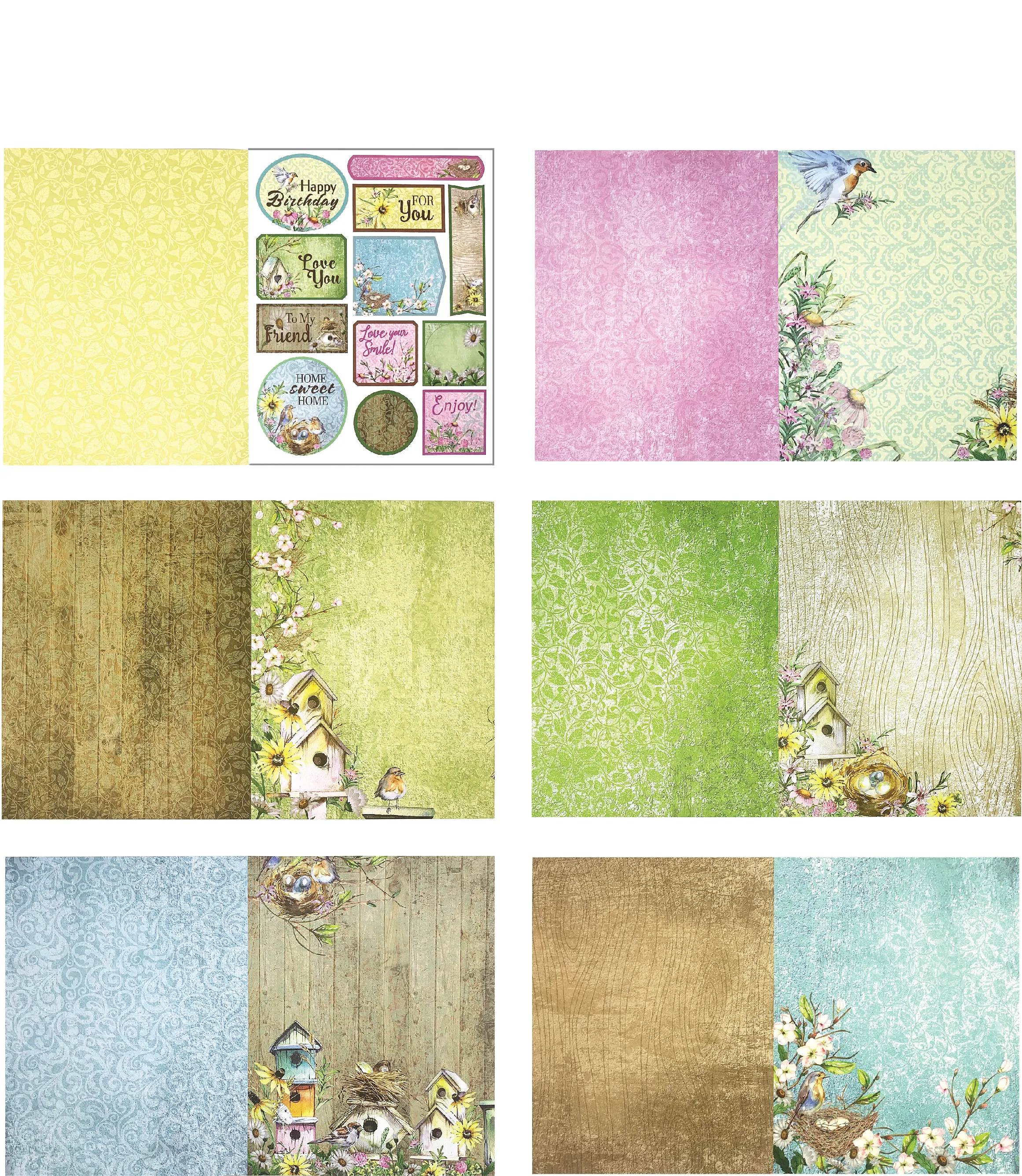 A Nesting Place 8.5"x11" Patterned Cardstock from Hot Off The Press! A Nesting Place Patterned 8.5"x11" Cardstock pack consists of adorable birdhouses against shades of green, blue, and lavender! Sheets are filled with stylish patterns, intricate lace, and beautiful flowers. 12 sheets (2 each of 6 designs) of 65# cover weight cardstock, 8.5"x11" sheets! Pack includes 36 cutouts! Sheets are acid & lignin free. Made in the USA! Paper Wishes Exclusive!