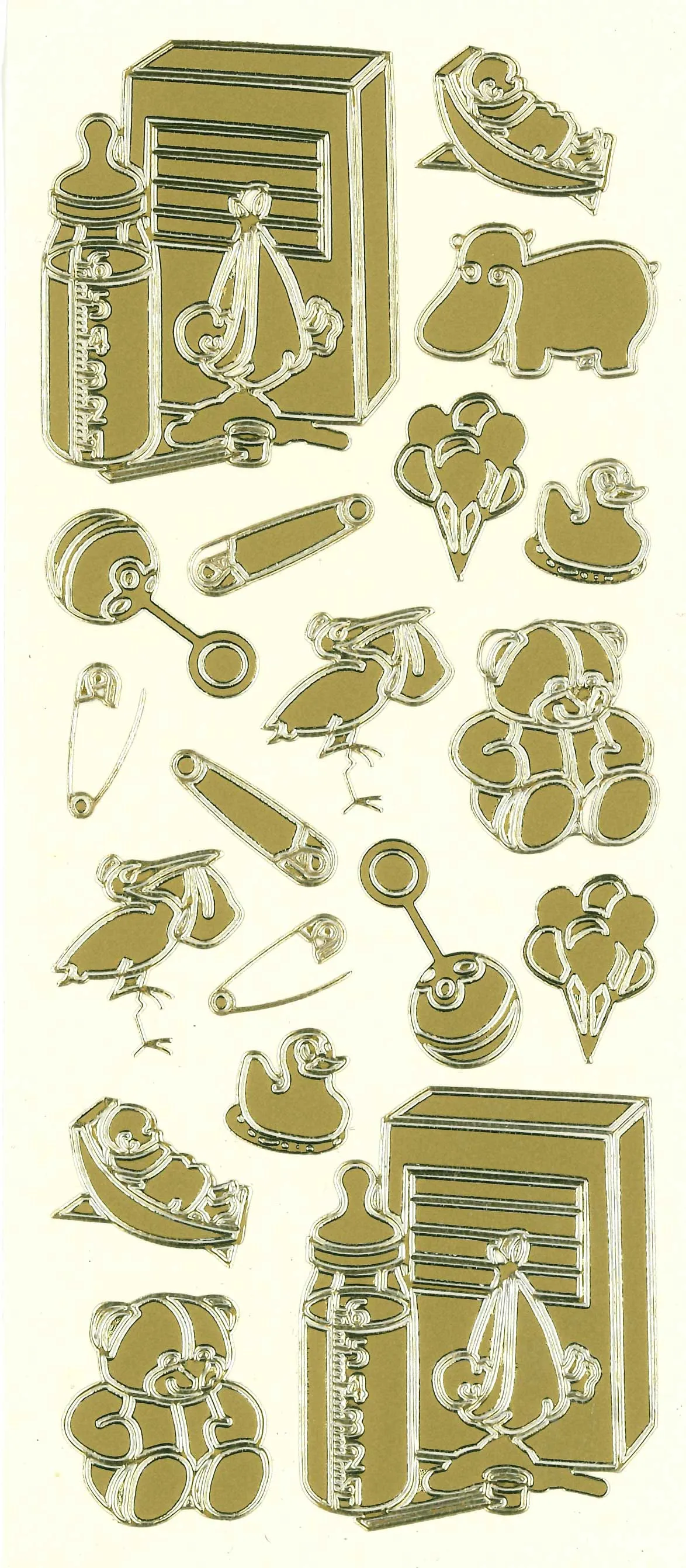 19 Baby Gold Peel Off Stickers from Mark Richards Collection! This 4"x9" sheet includes images of balloons, saftey pins, rattles, and so much more! The perfect way to personalize your craft projects. Just simply peel and stick! This package contains one 4"x9" sheet of stickers. 19 images in gold finish.