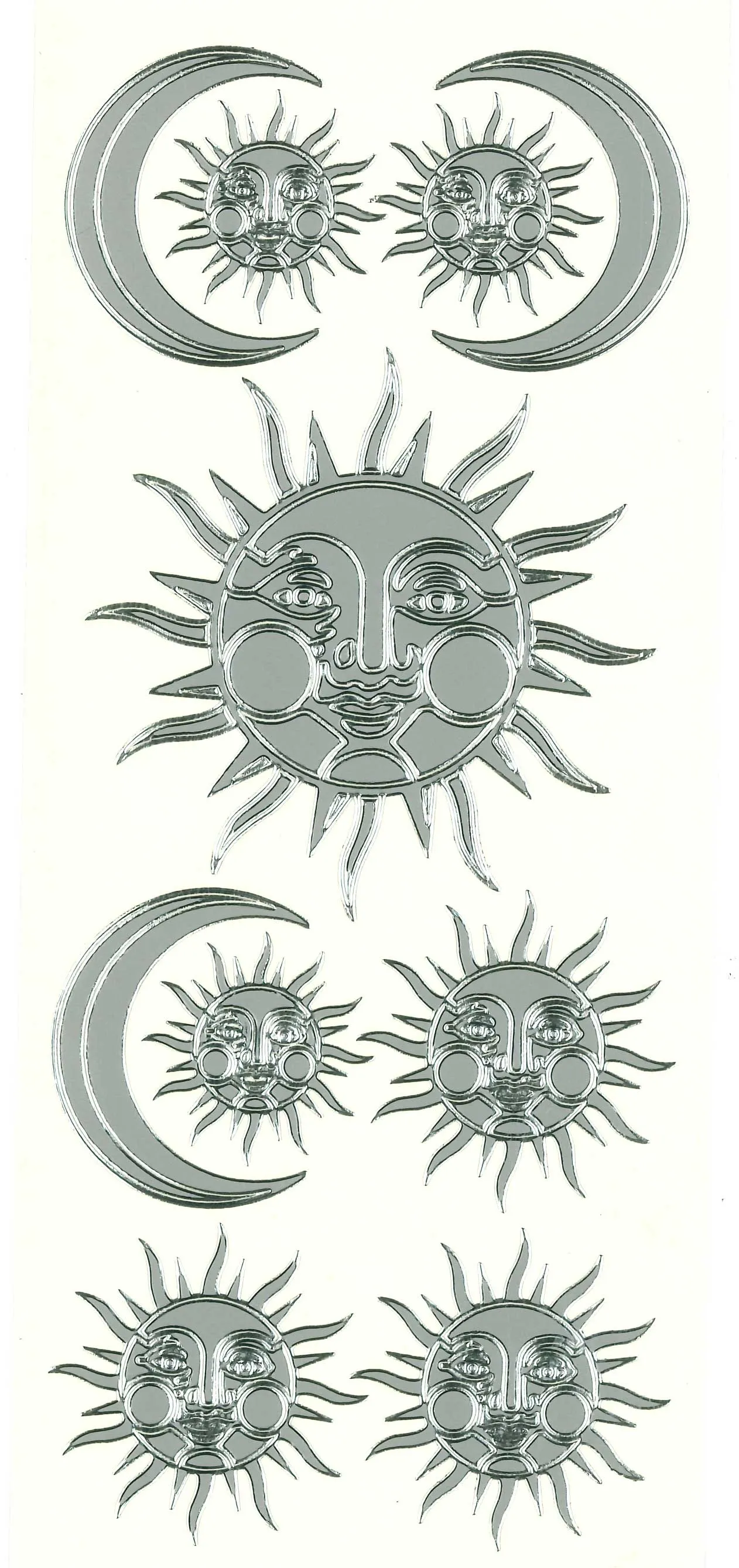 13 Sun & Moon Silver Peel Off Stickers from Mark Richards Collection! This 4"x9" sheet features half moons and suns. The perfect way to personalize your craft projects. Just simply peel and stick! This package contains one 4"x9" sheet of stickers. 13 images in silver finish.
