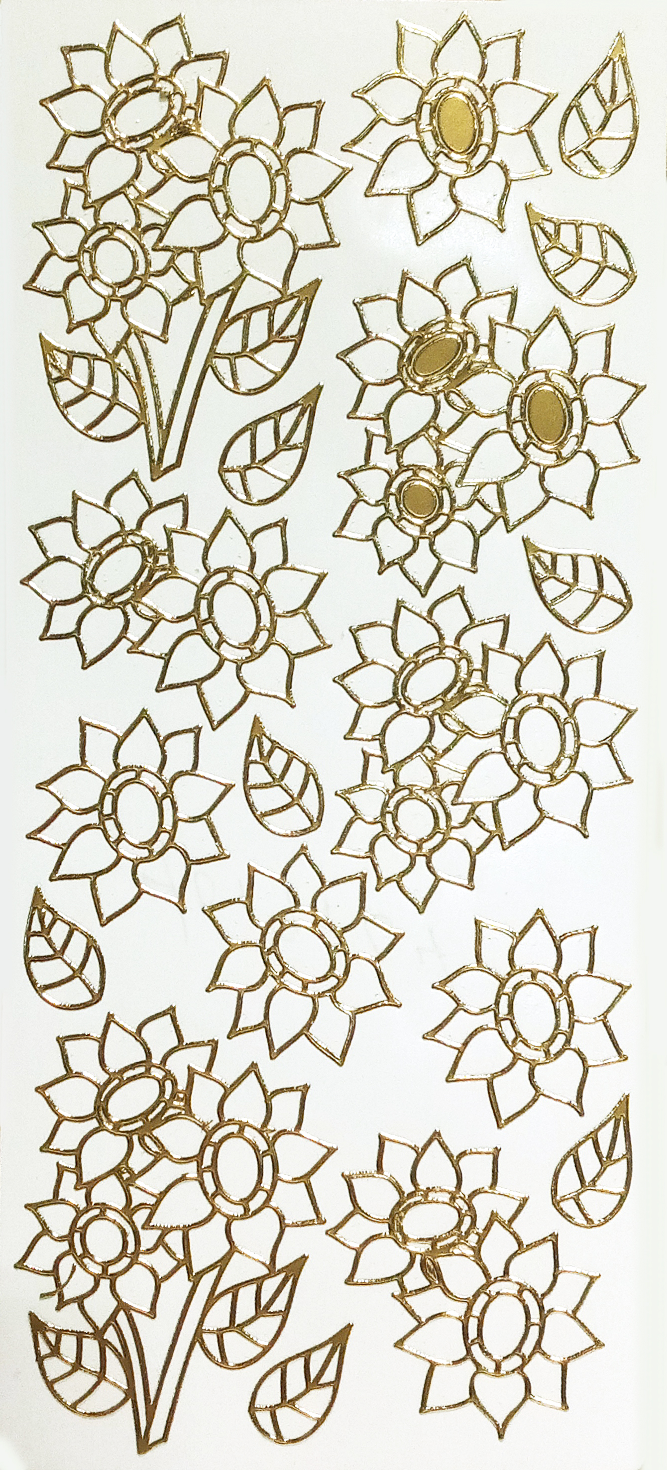 18 Sunflowers Gold Peel Off Stickers from Mark Richards Collection! This 4"x9" sheet features a mixture of sunflowers and leaves! The perfect way to personalize your craft projects. Just simply peel and stick! This package contains one 4"x9" sheet of stickers. 18 images in gold finish.
