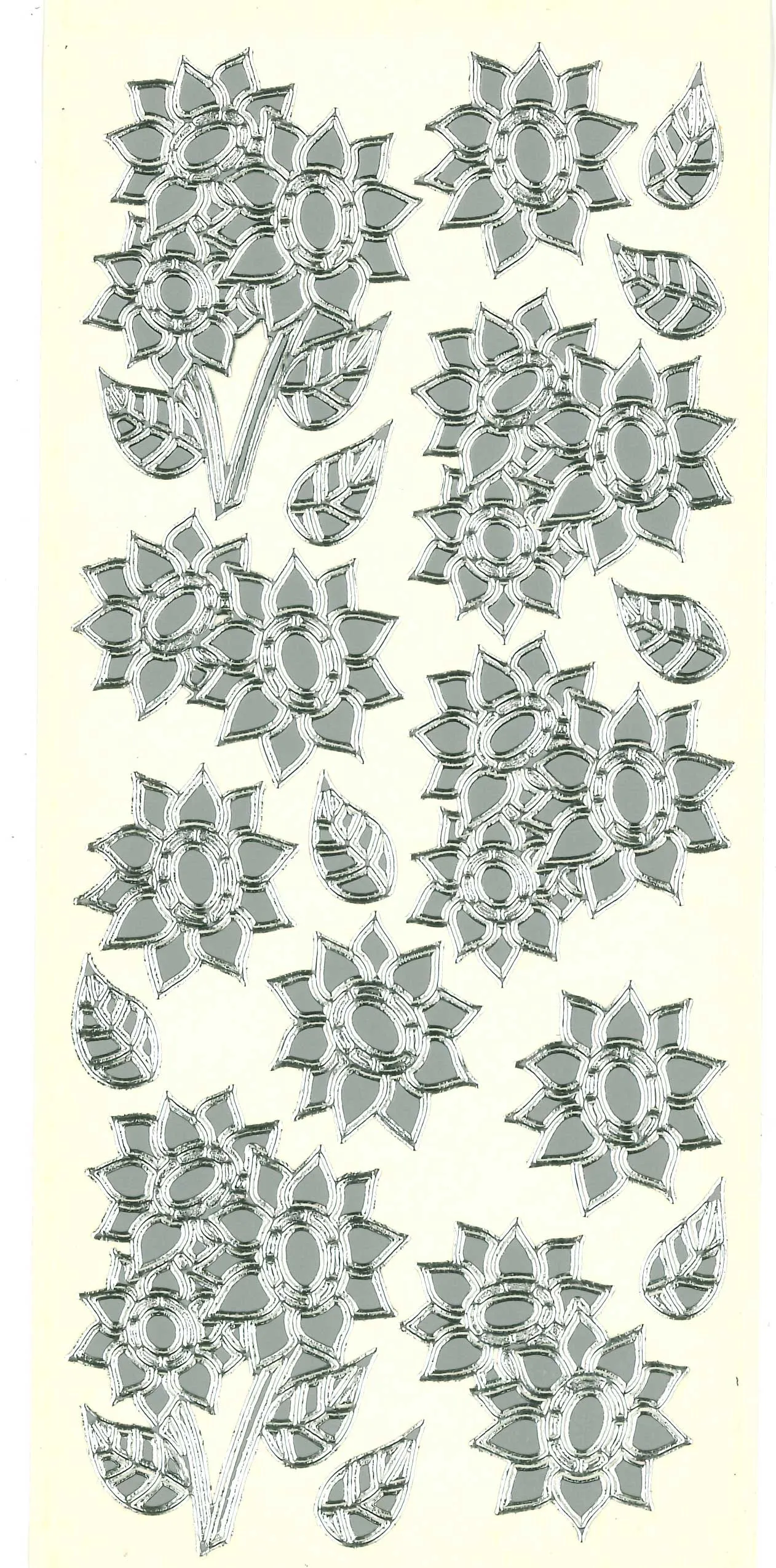 18 Sunflowers Silver Peel Off Stickers from Mark Richards Collection! This 4"x9" sheet features a mixture of sunflowers and leaves! The perfect way to personalize your craft projects. Just simply peel and stick! This package contains one 4"x9" sheet of stickers. 18 images in silver finish.