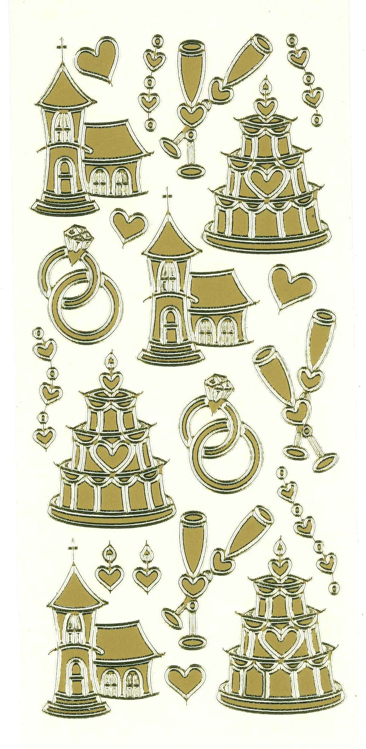 21 Wedding Cakes Gold Peel Off Stickers from Mark Richards Collection! This 4"x9" sheet features rings, hearts, wedding cakes, churches, and more to enhance your craft projects! Just simply peel and stick! This package contains one 4"x9" sheet of stickers. 21 images in gold finish.