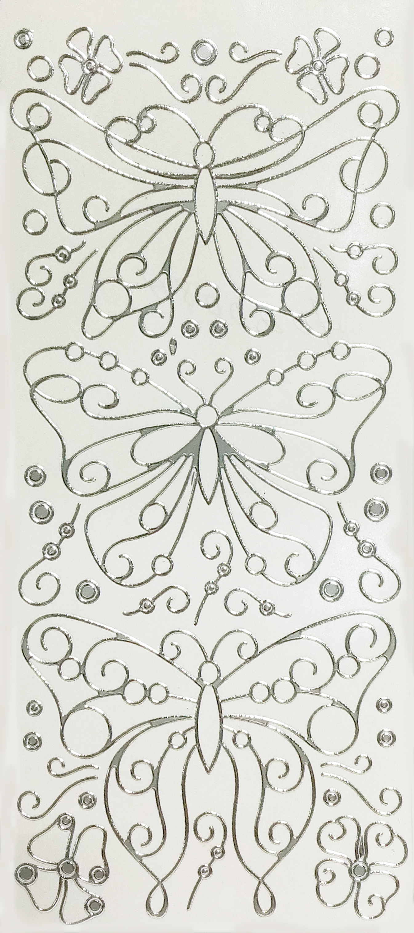 43 Butterflies 3 Silver Peel Off Stickers from Mark Richards Collection! This 4"x9" sheet features 3 large butterflies, swirls, flowers, and more to decorate your craft projects! Just simply peel and stick! This package contains one 4"x9" sheet of stickers. 43 images in silver finish.