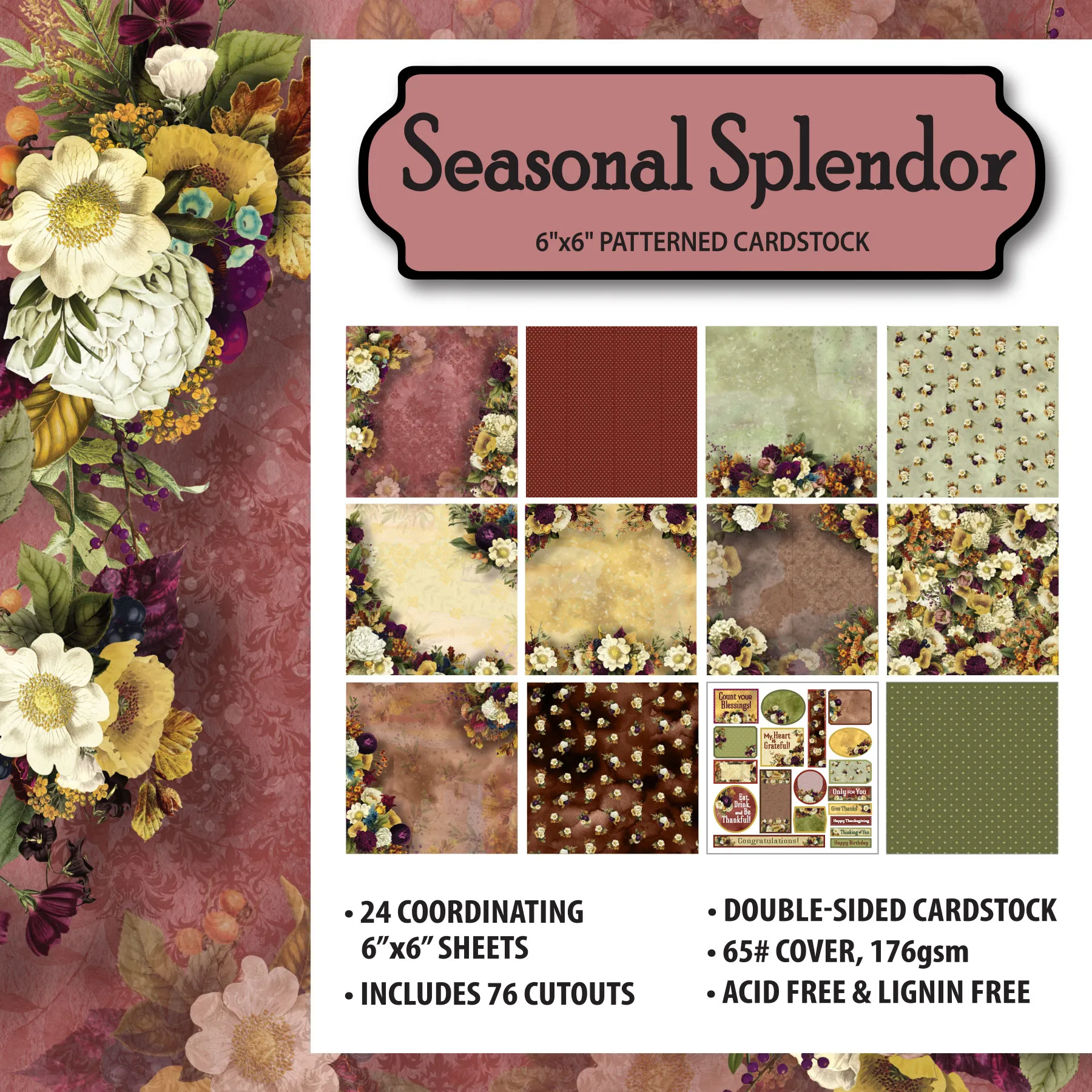 Seasonal Splendor 6"x6" Patterned Cardstock from Hot Off The Press! Seasonal Splendor 6"x6" Patterned Cardstock pack consists of stunning florals mixed with intricate patterns in shades of burgundy, green, yellow, purple, and brown. 24 sheets (4 each of 6 designs) of 65# cover weight double-sided cardstock, 6"x6" sheets! Pack includes 76 cutouts! Sheets are acid & lignin free. Made in the USA! Paper Wishes Exclusive!
