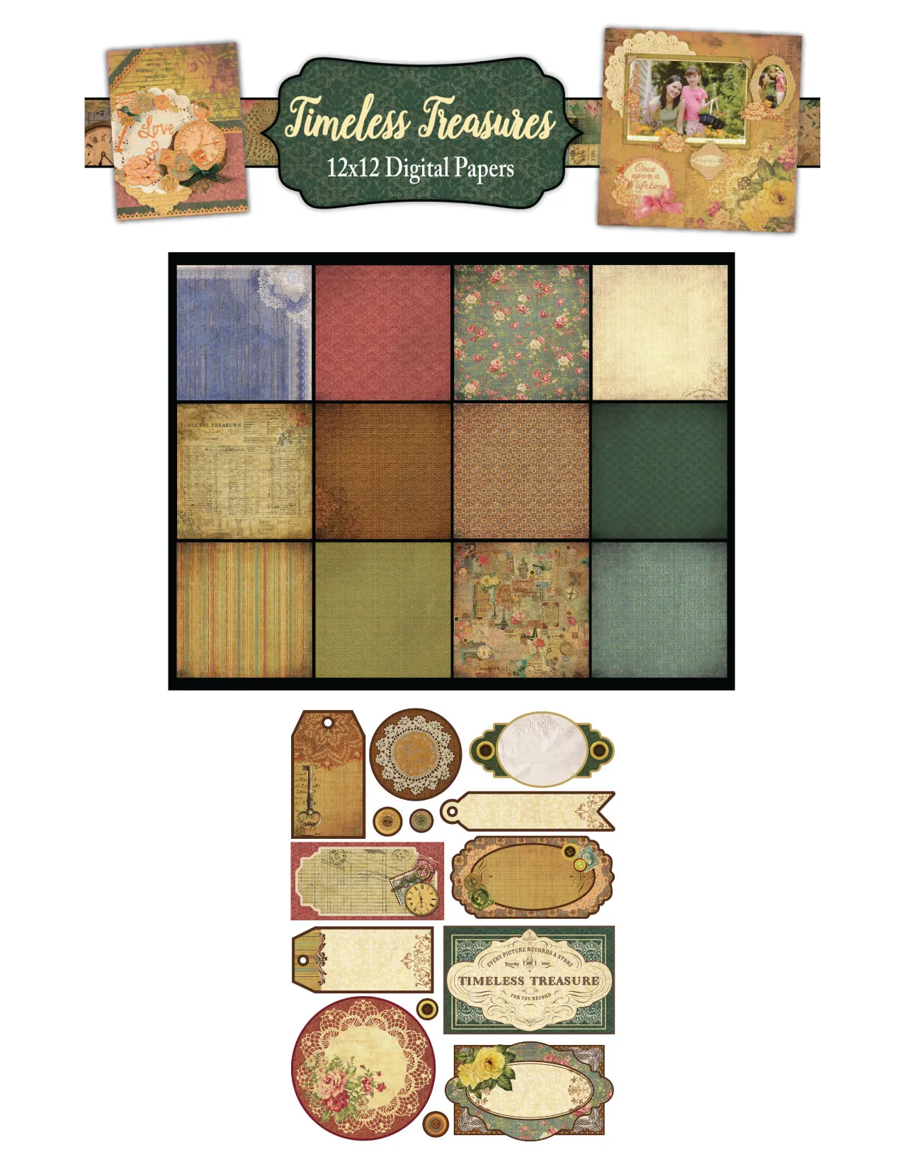 This stunning collection of digital papers consists of timeless treasures, florals, and all-over prints, in rich tones. They are versatile and perfect for digital scrapbooking, and digital layouts, OR print them out for traditional scrapbooking, card making and paper crafting. Paper Wishes Exclusive!