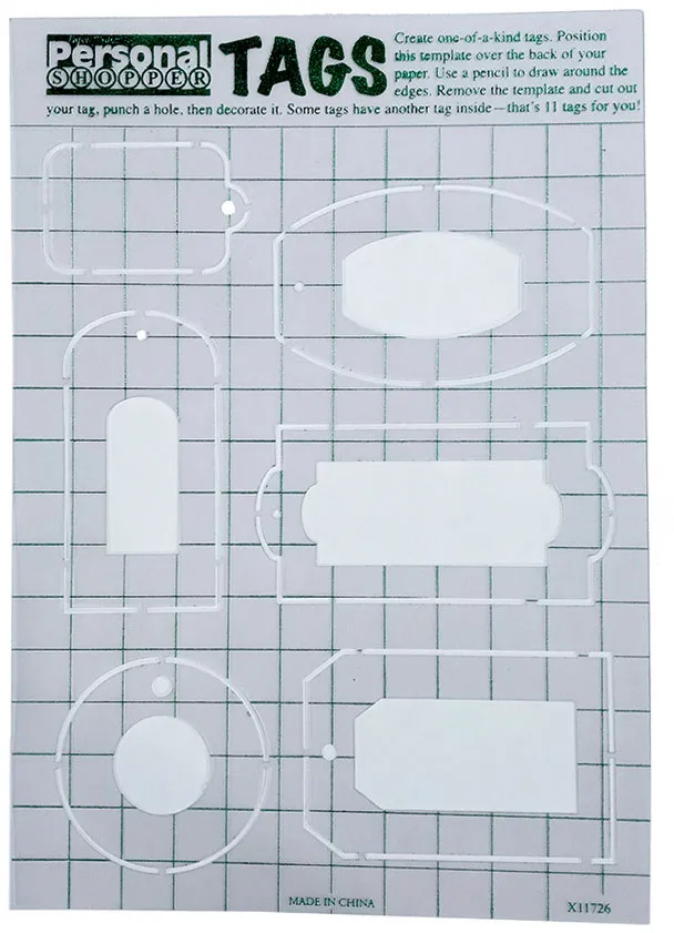 Tags Template by Hot Off The Press! This 6"x8.5" plastic template has 11 tag shapes on it. Simply place over the back of your paperand draw around the edges. Lift off the template and cut along the lines you've drawn. If desired, use a punch to make a hole in the top. So easy! Paper Wishes exclusive.