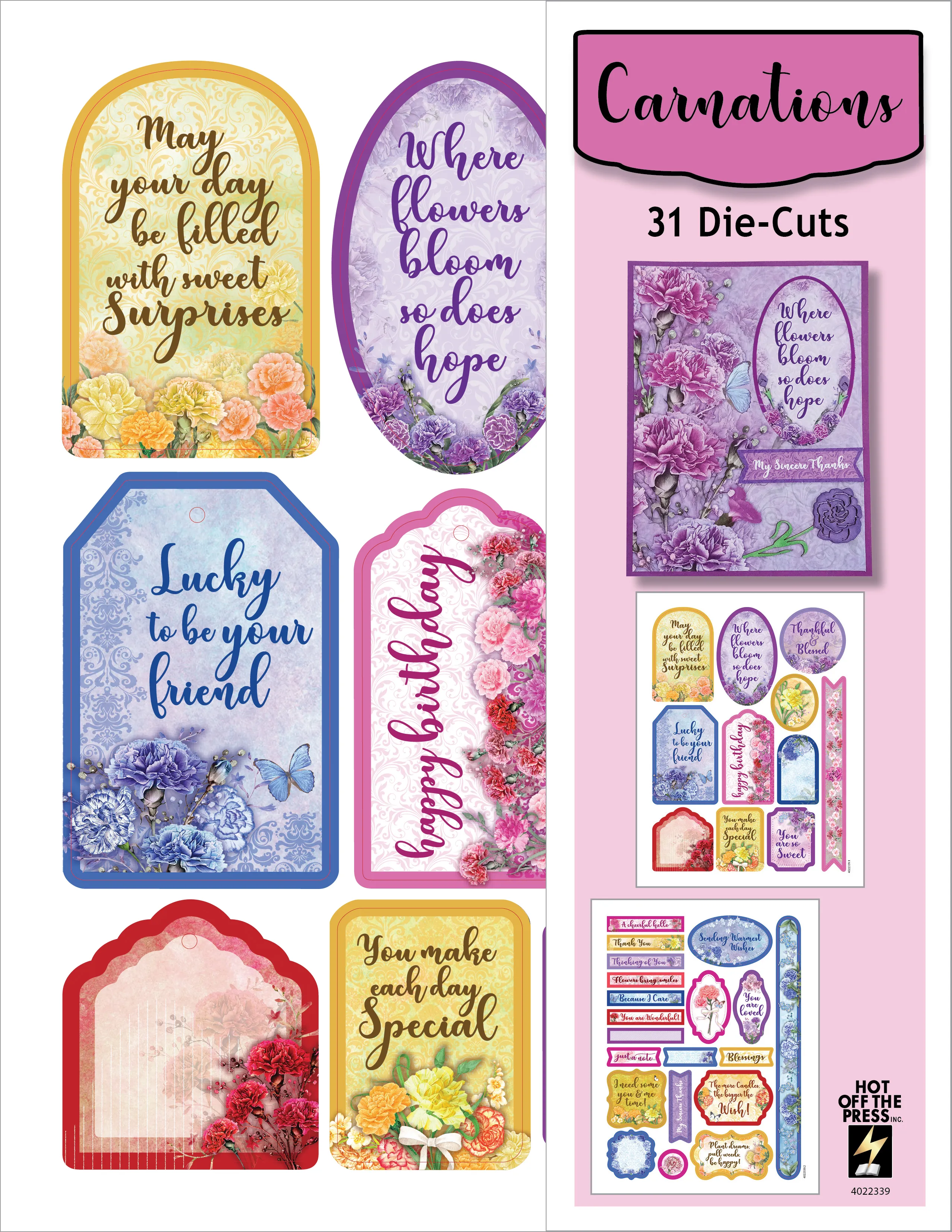 This 22 piece Carnations Chipboard set adds a unique touch to your cards, scrapbooking and other projects. Pieces include flower heads, butterflies, stemmed carnations, and more! This chipboard has been cut with a beam of light! The back side may be slightly scorched in the process. Gently pop out the pieces to use. Use as they come or color with ink pads, markers, embossing powders or other coloring agents.