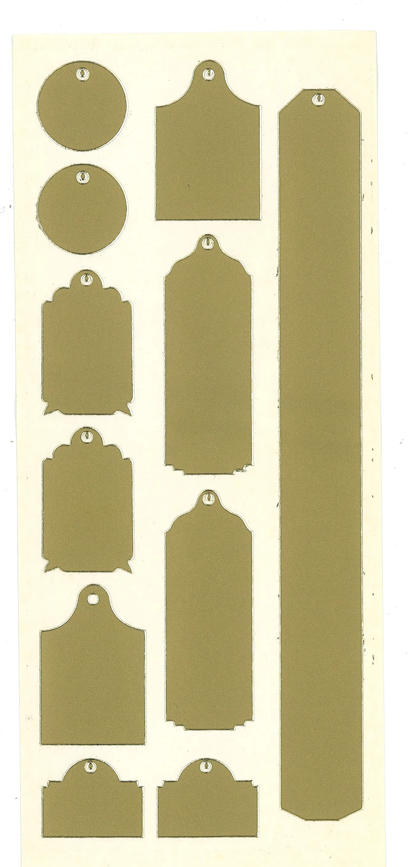 This 4"x9" sheet features tags in a variety of shapes and sizes to enhance your craft projects! Just simply peel and stick! This package contains one 4"x9" sheet of stickers. 11 images in gold finish.