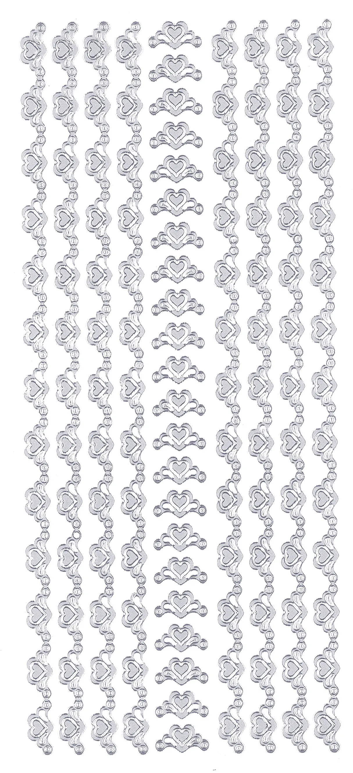 This 4"x9" sheet features heart borders to enhance your craft projects! Just simply peel and stick! This package contains one 4"x9" sheet of stickers. 30 images in silver finish.