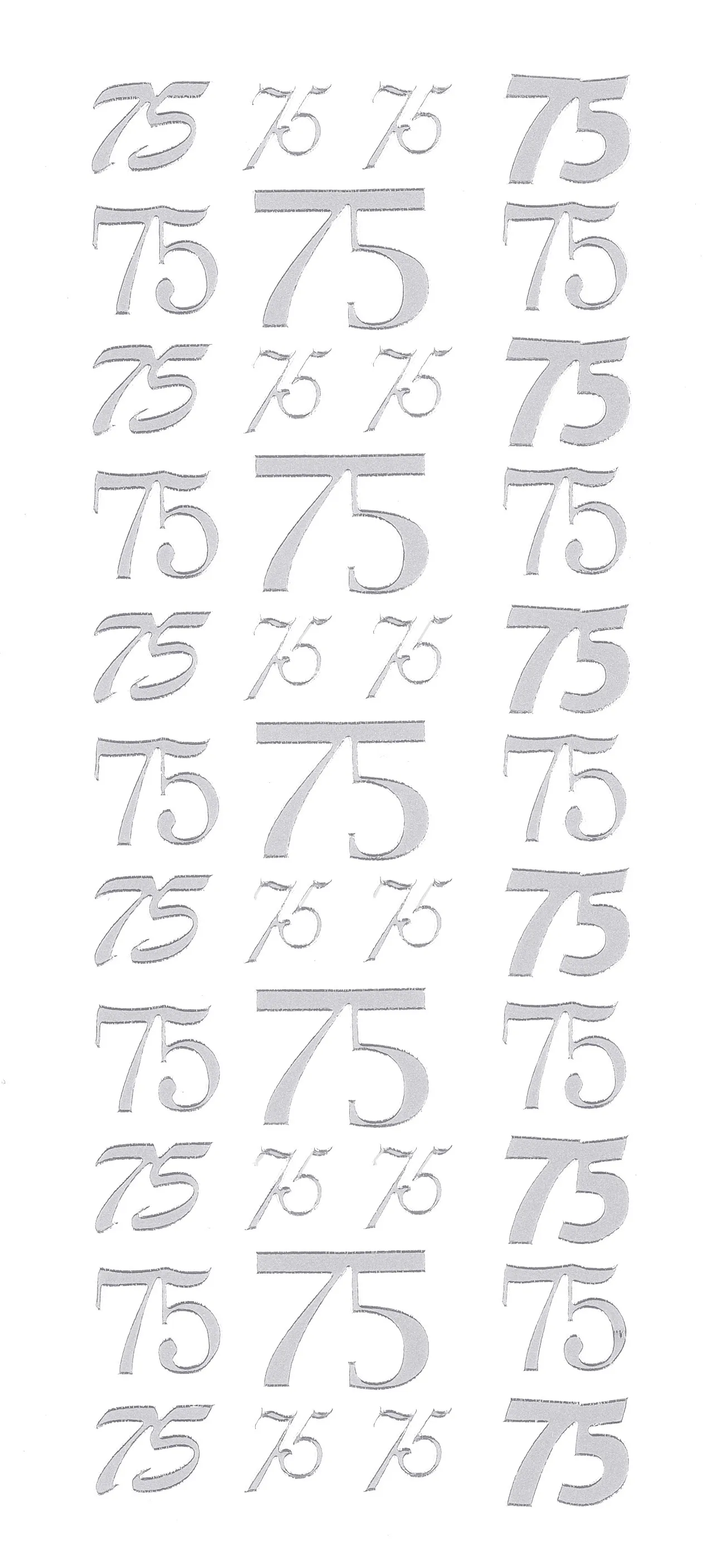 This 4"x9" sheet features the number 75 in a variety of sizes and fonts to enhance your craft projects! Just simply peel and stick! This package contains one 4"x9" sheet of stickers. 39 images in silver finish.