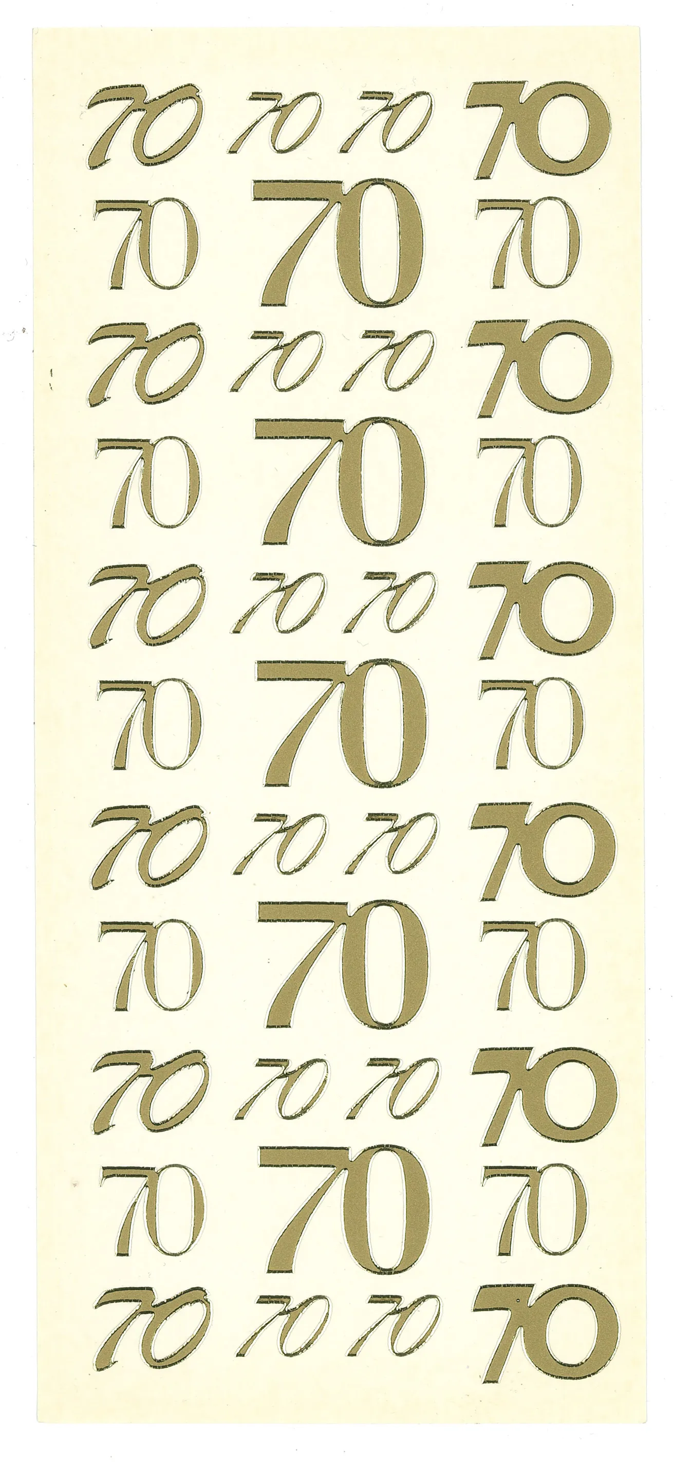 This 4"x9" sheet features the number 70 in a variety of sizes and fonts to enhance your craft projects! Just simply peel and stick! This package contains one 4"x9" sheet of stickers. 39 images in gold finish.