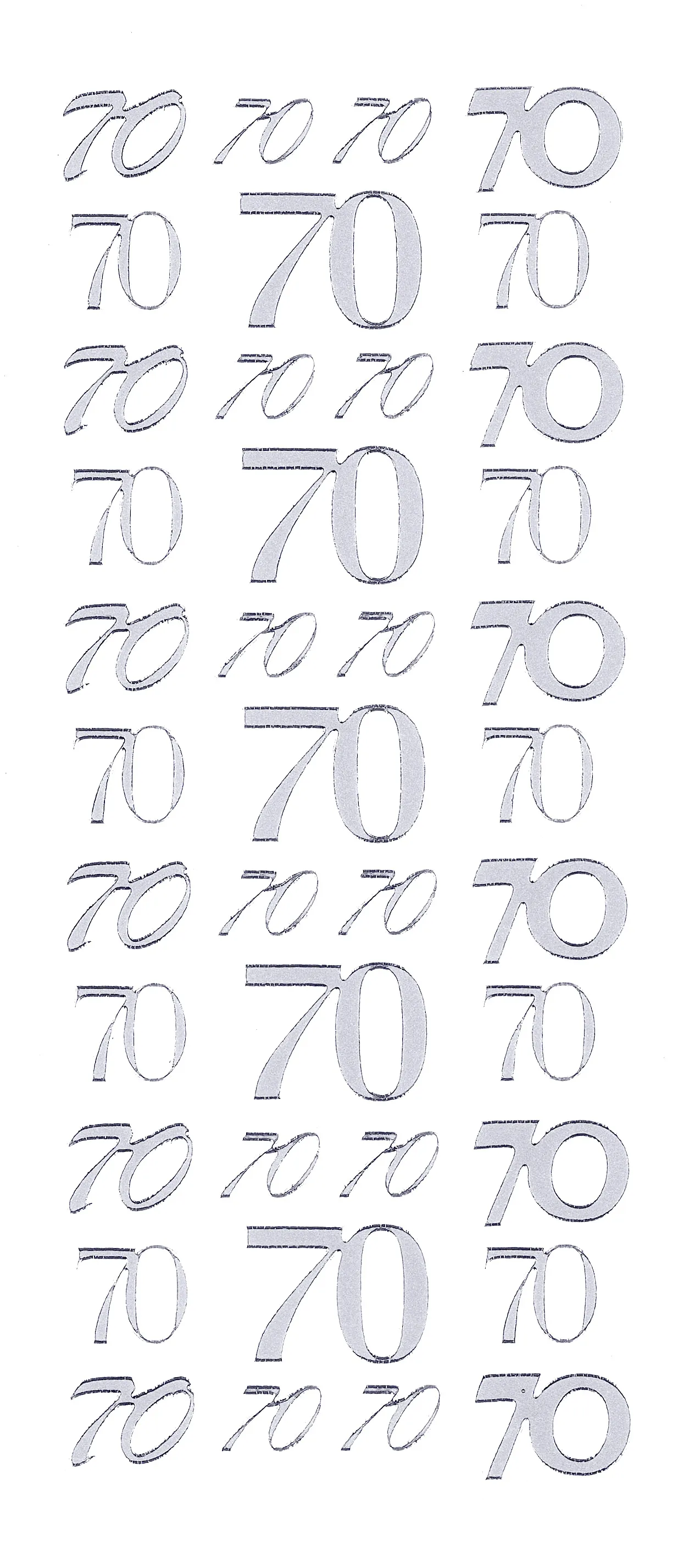 This 4"x9" sheet features the number 70 in a variety of sizes and fonts to enhance your craft projects! Just simply peel and stick! This package contains one 4"x9" sheet of stickers. 39 images in silver finish.