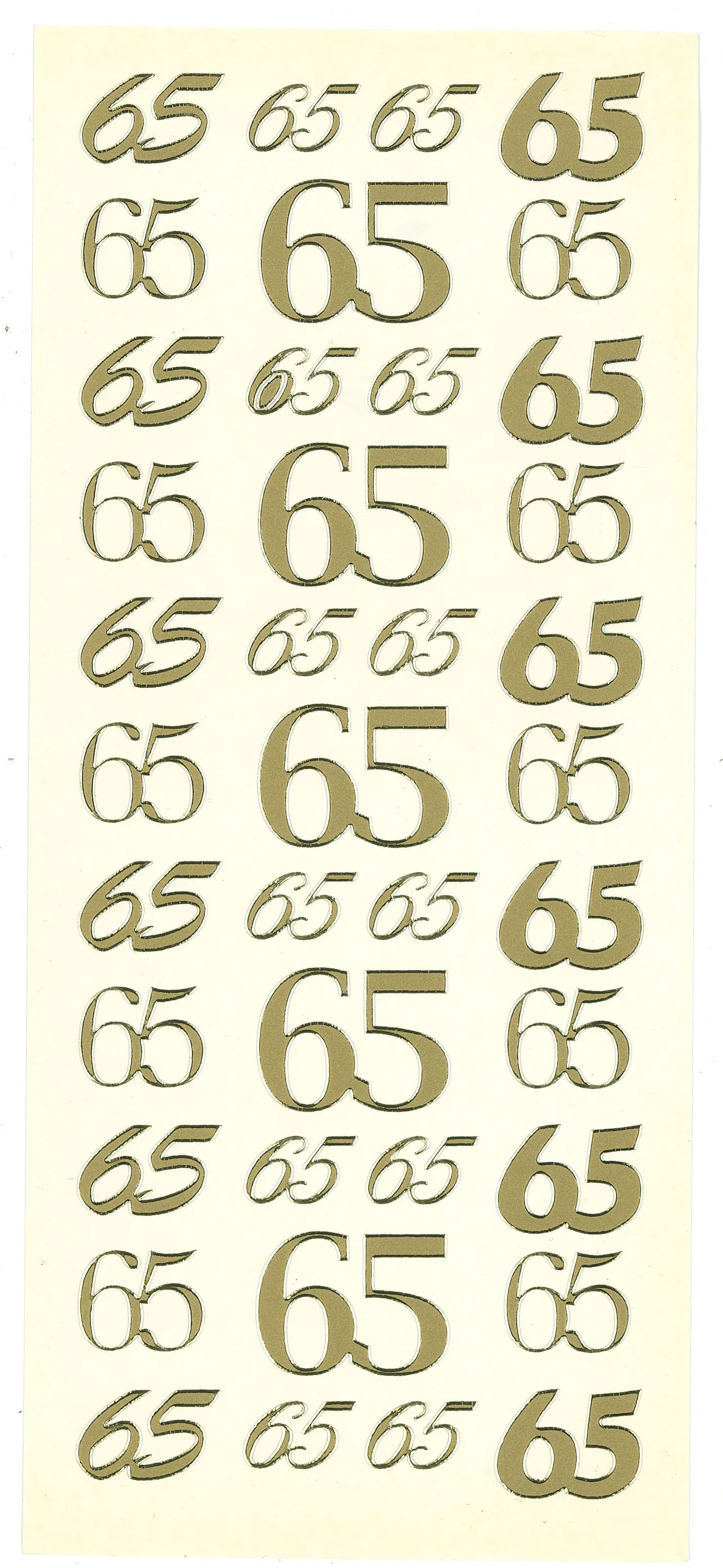 This 4"x9" sheet features the number 65 in a variety of sizes and fonts to enhance your craft projects! Just simply peel and stick! This package contains one 4"x9" sheet of stickers. 39 images in gold finish.