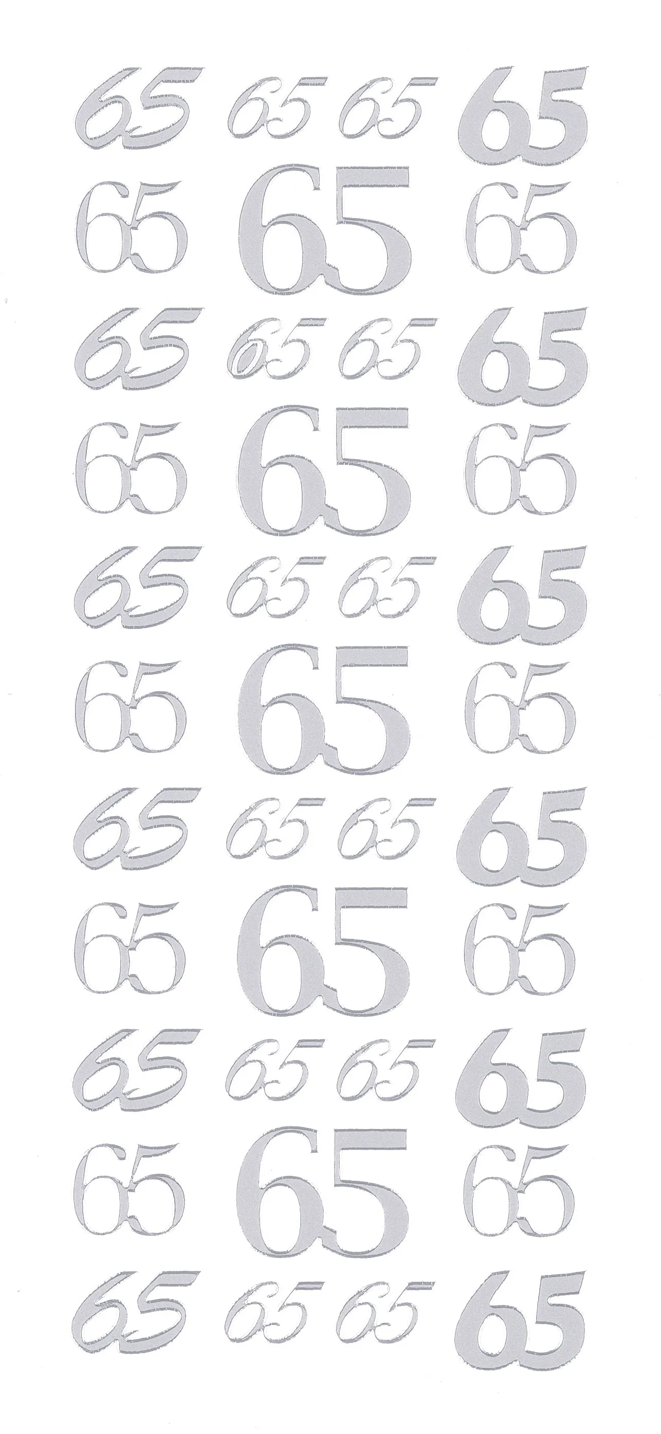 This 4"x9" sheet features the number 65 in a variety of sizes and fonts to enhance your craft projects! Just simply peel and stick! This package contains one 4"x9" sheet of stickers. 39 images in silver finish.