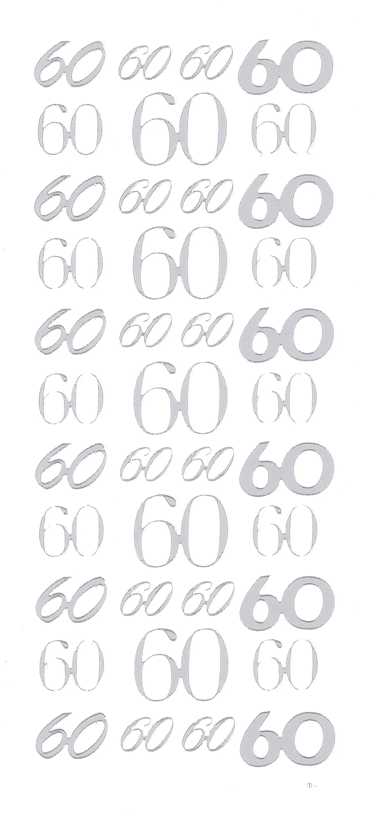 This 4"x9" sheet features the number 60 in a variety of sizes and fonts to enhance your craft projects! Just simply peel and stick! This package contains one 4"x9" sheet of stickers. 39 images in silver finish.