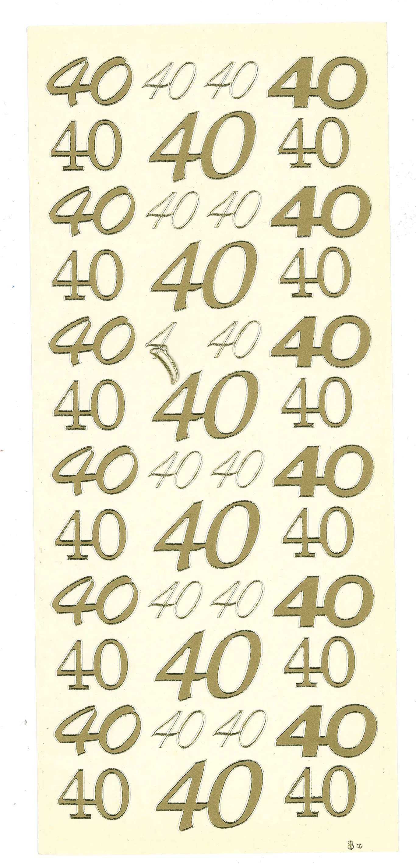 This 4"x9" sheet features the number 40 in a variety of sizes and fonts to enhance your craft projects! Just simply peel and stick! This package contains one 4"x9" sheet of stickers. 42 images in gold finish.
