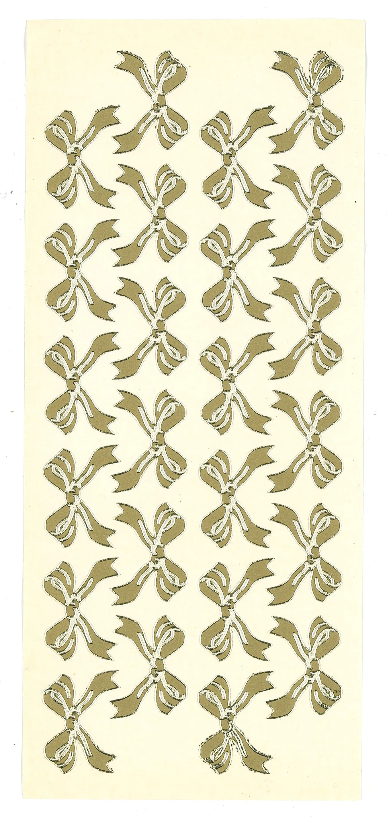 This 4"x9" sheet features bows to enhance your craft projects! Just simply peel and stick! This package contains one 4"x9" sheet of stickers. 24 images in gold finish.