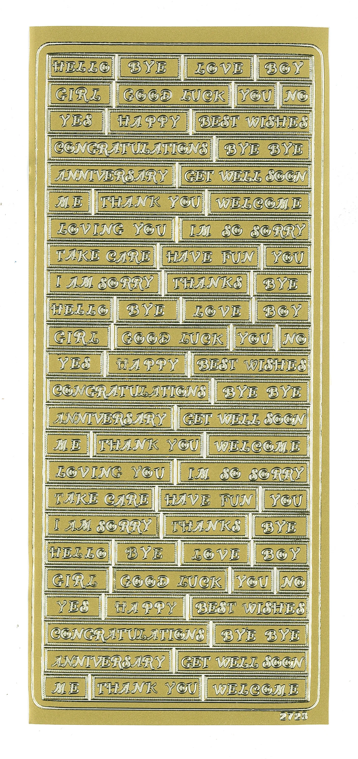 This 4"x9" sheet features engraved greetings to enhance your craft projects! Just simply peel and stick! This package contains one 4"x9" sheet of stickers. 70 images in gold finish.