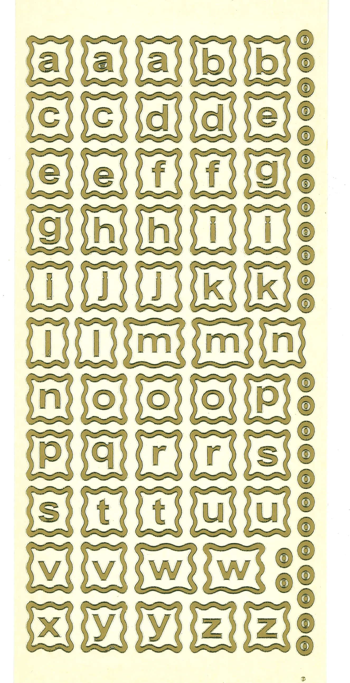 This 4"x9" sheet includes multiples of the alphabet in frames. The perfect way to personalize your craft projects. Just simply peel and stick! This package contains one 4"x9" sheet of stickers. 54 images in gold finish.